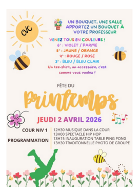 Par admin lmfournet, publié le mercredi 25 mars 2026 08:33 - Mis à jour le mercredi 25 mars 2026 08:35Le jeudi 2 avril venez au collège en couleur! 6eme: violet/parme 5eme: jaune/orange 4eme: rouge/rose 3eme: bleu/bleur clair -