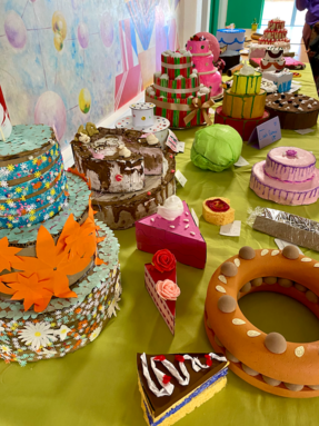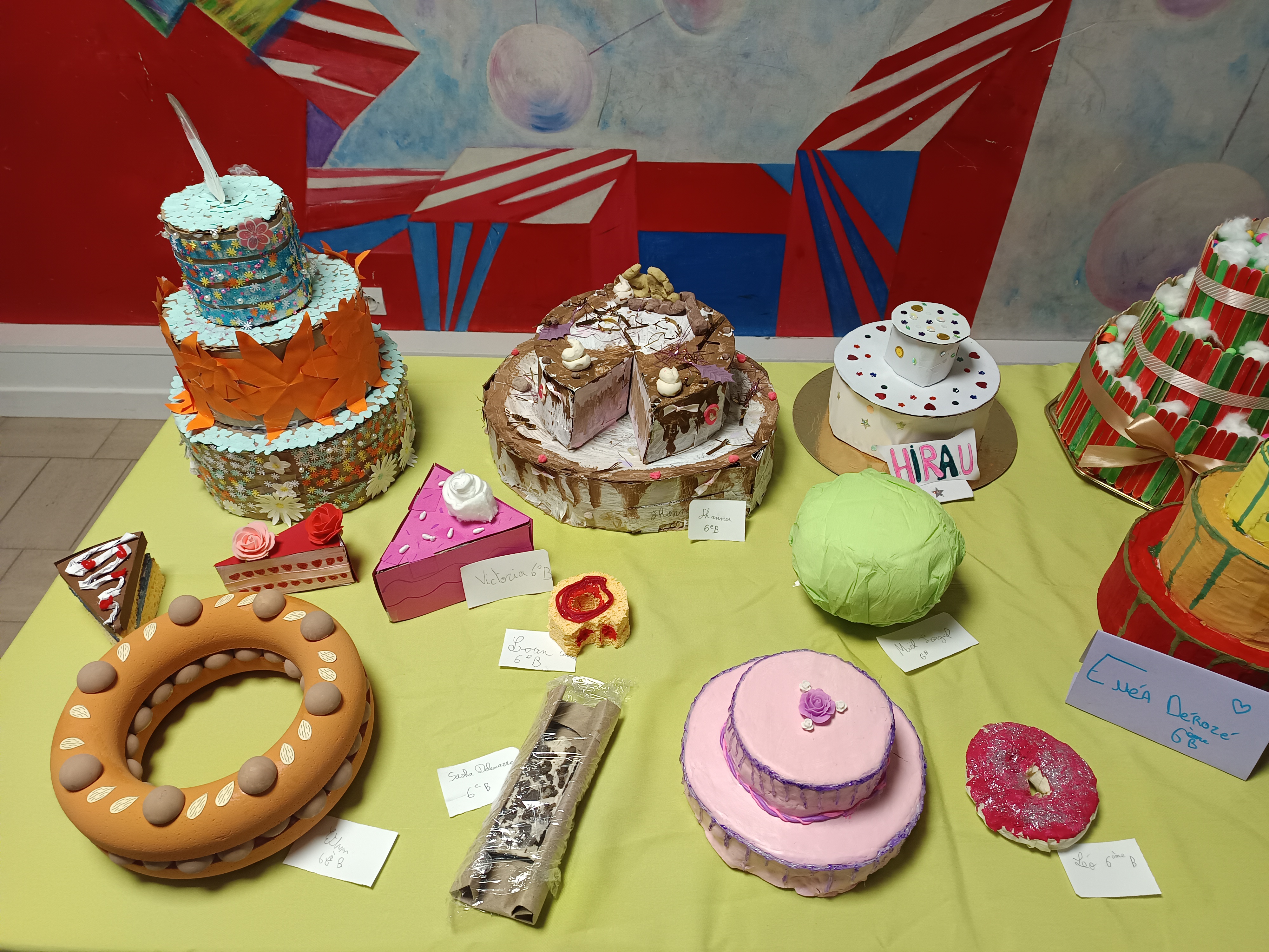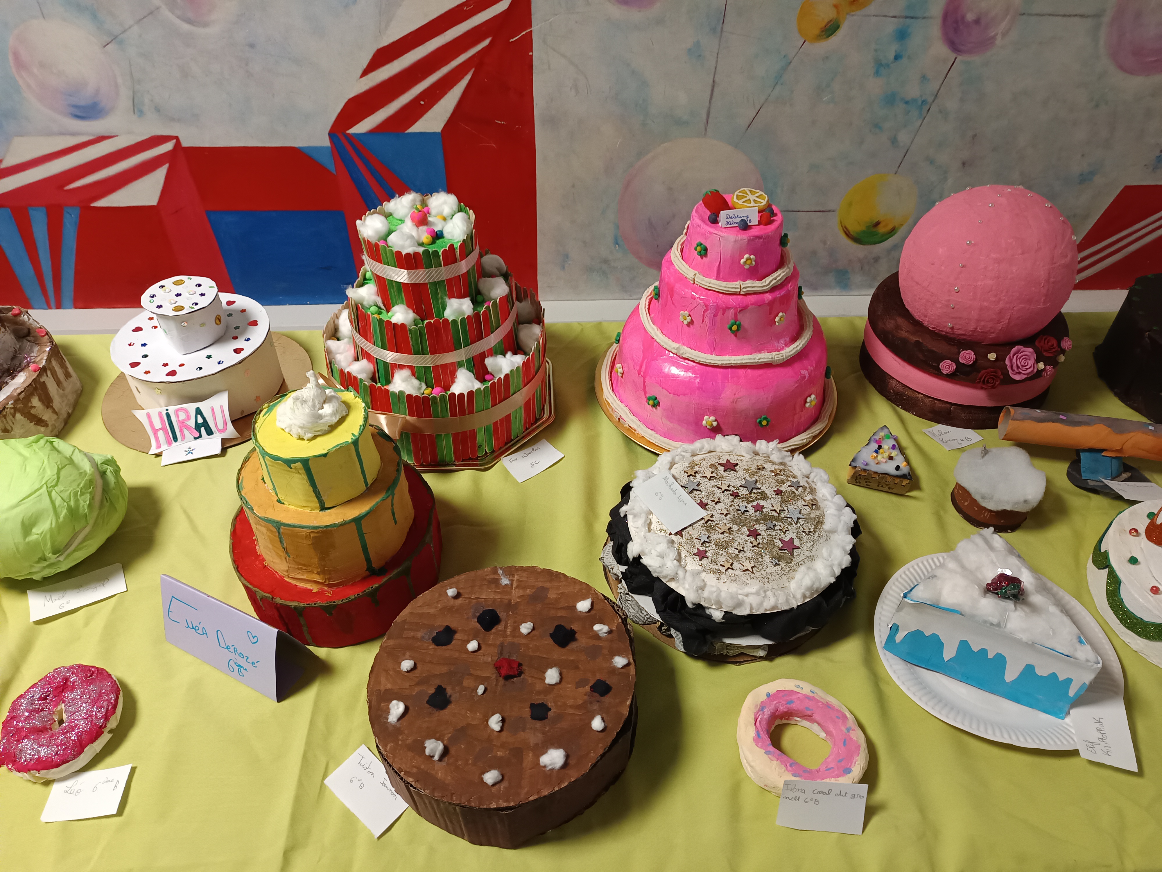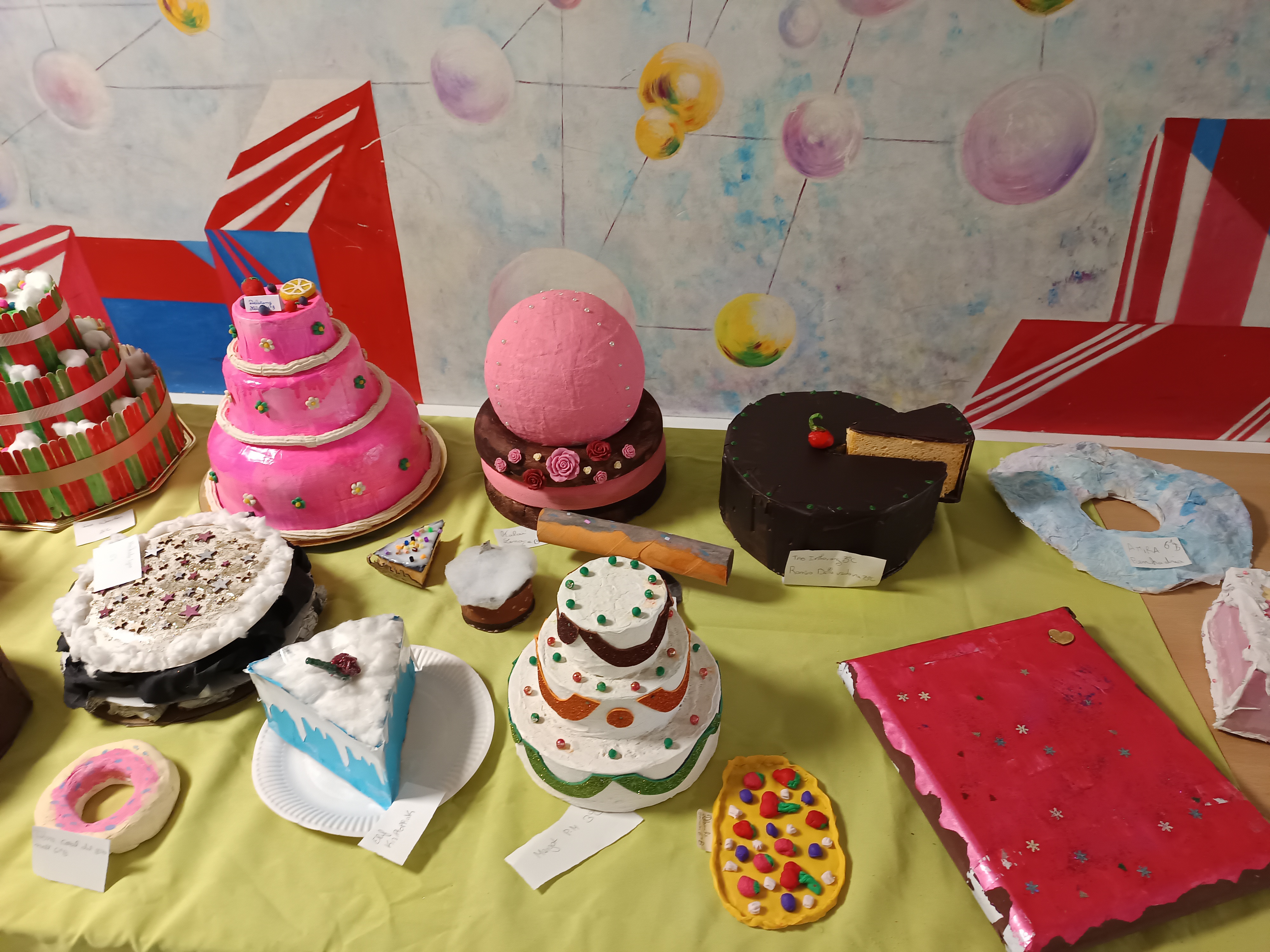 Cette semaine vous avez certainement croisé une installation d’œuvres dans le hall du collège. Les élèves ont créé des gâteaux d’apparence appétissants qui sont en réalités non-comestibles ! Chaque faux gâteau est une œuvre qui joue avec les formes, les couleurs et les textures, elles nous invitent à réfléchir sur ce que l’on voit et ce que l’on mange.