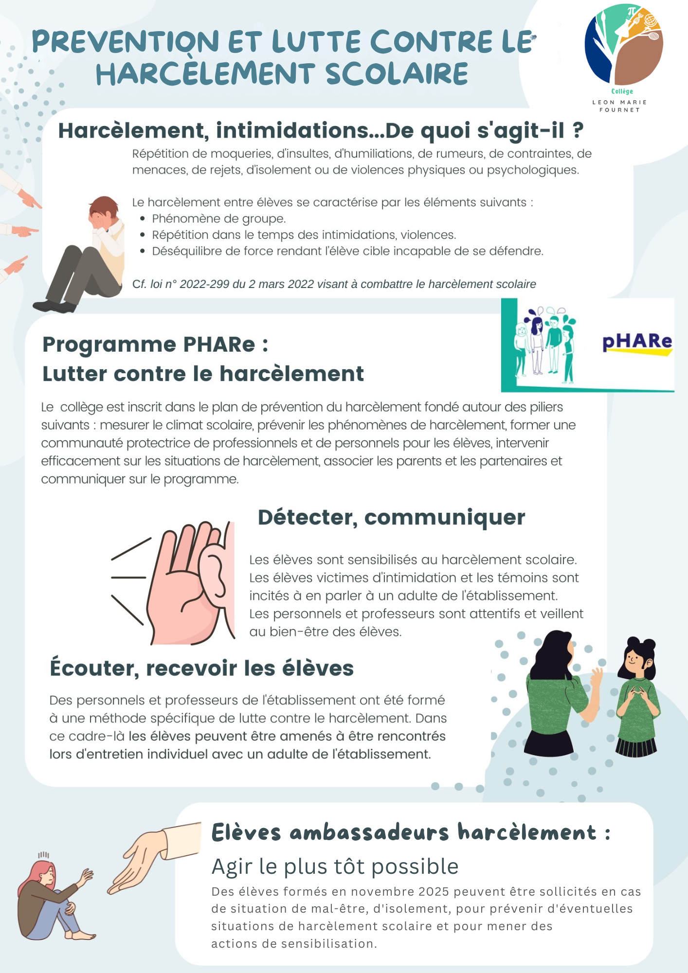 Le collège est inscrit dans le dispositif PHARE (programme de lutte contre le harcèlement) et compte une équipe ressource pluri-catégorielle composée de 12 personnels pour l'année 2025/2026.